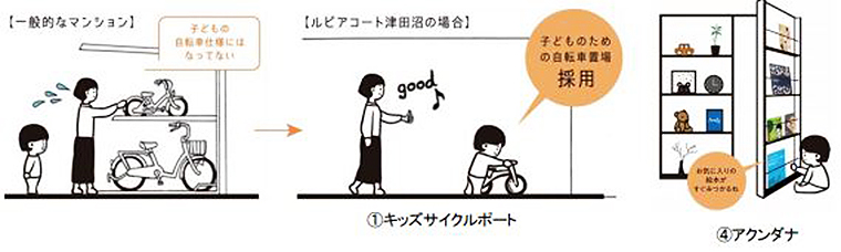 また、『ルピアコート津田沼』では、機械式駐車場内での事故から子どもを守る『車の出し入れ まもるんスペース』(実用新案取得済)も設置。