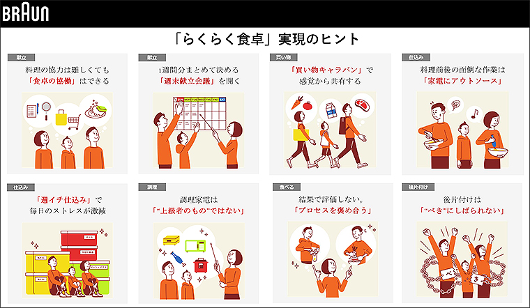 「らくらく食卓を考える会」は今回、それぞれの家庭にあった「らくらく食卓」を実現するための“8つヒント”を紹介。