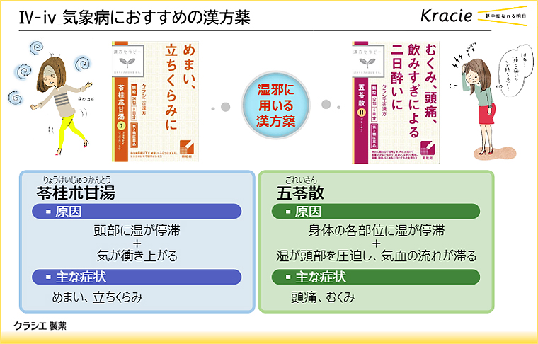 クラシエ薬品は「水滞症状にはしっかりとしたケアが必要」ということで、こうした湿邪に用いる漢方薬として、苓桂朮甘湯(りょうけいじゅつかんとう)や、五苓散(ごれいさん)を紹介。