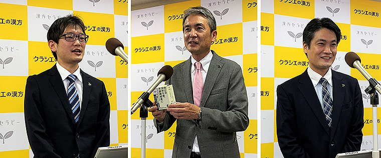 クラシエ製薬 副社長執行役員 兼 薬品経営企画室長 草柳徹哉 取締役、クラシエ薬品 ヘルスケア事業部 学術部 中医学士 山本政春 課長、同部 矢嶋浩平 係長らが登壇し、気象病におすすめの食材・ツボ・漢方薬などについて説明した。