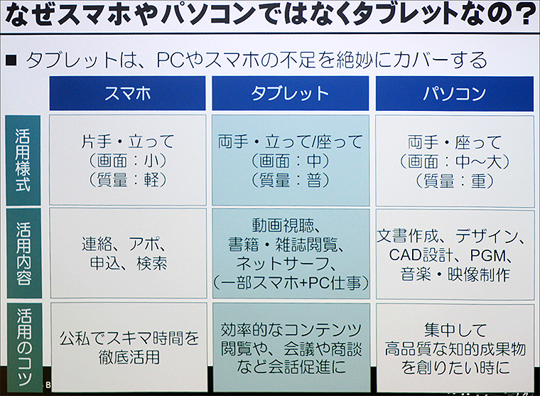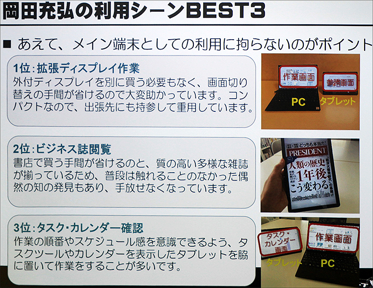 そこで、岡田代表は「あえてメイン端末としての利用にこだわらないことがポイント」と前置きし、タブレットPC活用シーンベスト3をこうあげた。