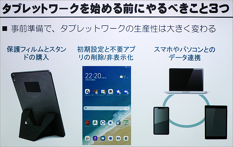 「まずやることが、初期設定後の不要アプリ削除。この事前準備でタブレットPCワークの生産性は大きく変わる。スマートフォンやパソコンとのデータ連携も忘れずに」