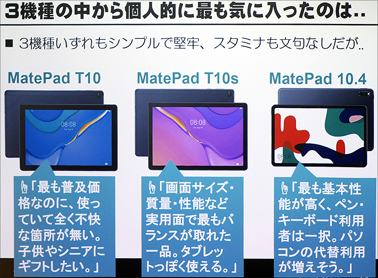 「HUAWEI MatePad T10/T10s/10.4の3機種のなかでも『これはいい』と思って自腹で買ったのが、T10s。画面サイズ・質量・性能など、実用面でも最もバランスがとれたタブレット」