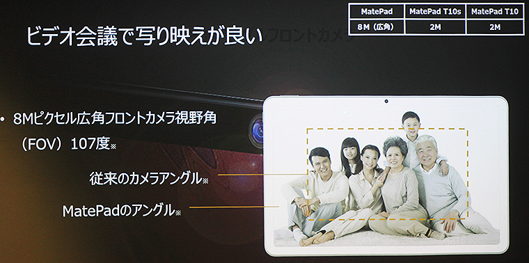 さらに気になったのは、カメラの画角と画面の視野角。他社ハイスペックモデルと同じくIPSで視野角は広く、MatePadのカメラ画角は107度と広々。8Mピクセル広角フロントカメラを搭載し、パーティやグループ会議などで広くビデオ撮影できるのがうれしい。