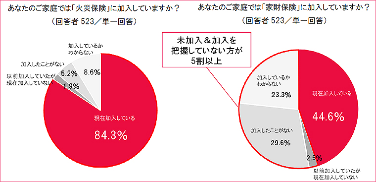◆持ち家世帯の「火災保険」加入率(建物への補償)は全体の約8割に対し、「家財保険」(家財への補償)は未加入&加入を把握していない方が5割以上
