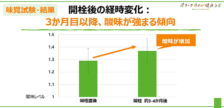 慶應義塾大学特任講師・AISSY 鈴木隆一 代表取締役社長らの調査によると、オリーブオイルは、開栓後約2か月半以降で風味が劣化し、3か月以降に酸味が強まり、酸化がすすんでいる可能性があると報告。