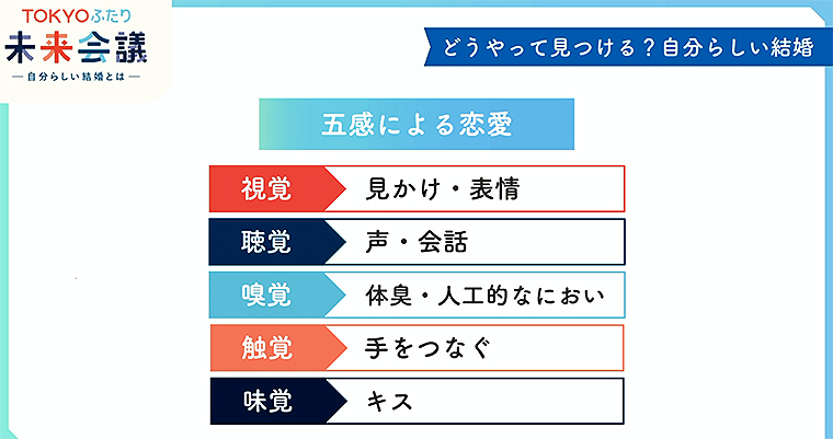 ―――そして最後、森川友義 教授は、「自分らしい結婚」をみつけるには、五感による恋愛がカギになることも教えてくれた。