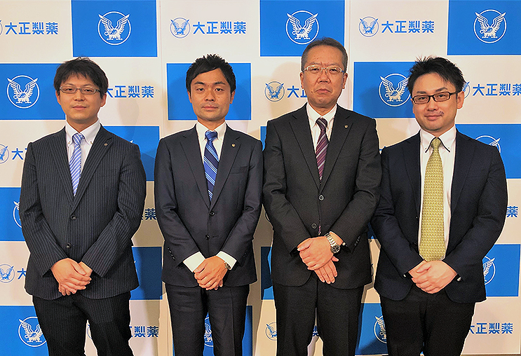 左から大正製薬 セルフメディケーション開発研究所 基盤研究室 新井良平主任、同 製剤第3研究室 開発1グループ 阿部晃也グループマネージャー 、同 長濱徹 室長、ネイチャーラボ セルラボ所属 共同開発コンサルタント 竹岡篤史氏