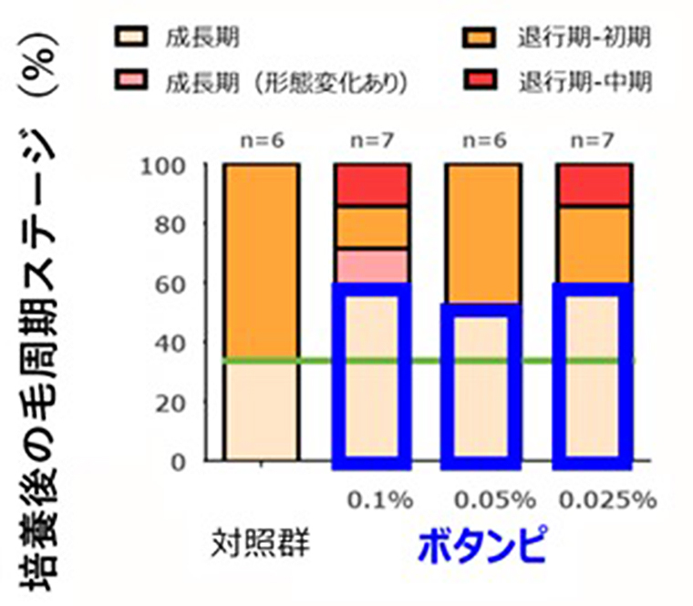 今回の研究で、「MITOL活性化成分:ボタンピエキス」を培養毛包に添加したところ、「ボタンピエキス」がヘアサイクルの「成長期」を延長させることを新たに見出した。