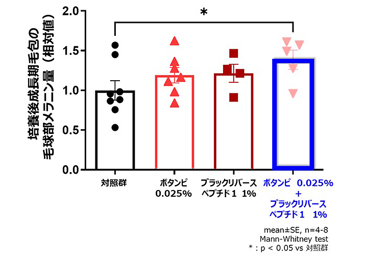 また、毛髪アンチエイジングにおいて共同研究するネイチャーラボのブラックリバースペプチド1が、ボタンピエキスの毛髪メラニンへの作用をさらに増強することを確認した。