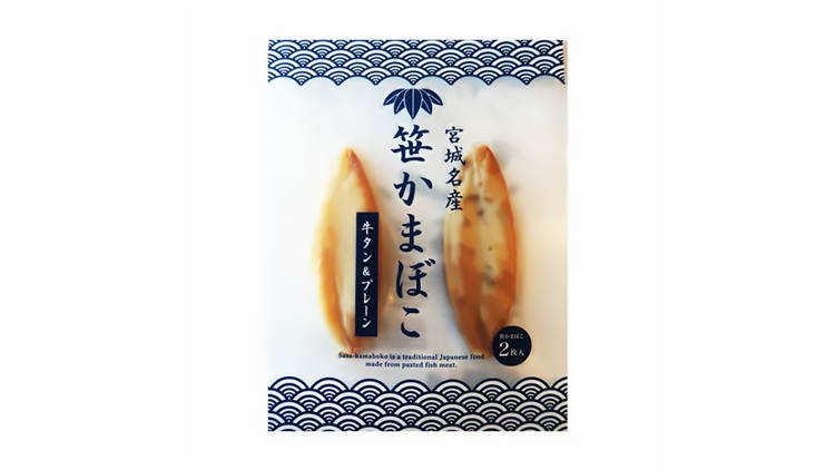 「胡椒風味がクセになる牛タン味と、白身魚の美味しさが楽しめるプレーン味の二種類の味が楽しめる、ぷりぷり食感の笹かまぼこです」