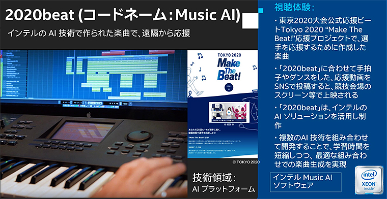 2020beatは、インテルのAIソリューション・プラットフォームを活用し制作。複数のAI技術を組み合わせて開発することで、学習時間を短縮しつつ、 最適な組み合わせでの楽曲生成を実現してくれる。