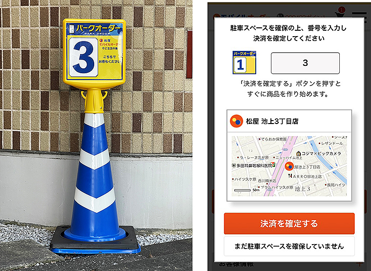 利用方法は「松屋パークオーダー」のシステム導入店舗で、カラーコーンが置いてある駐車スペースにクルマをとめ、松屋アプリ内オーダーシステム「モバイルオーダー」でメニューとカラーコーンの番号を入力するだけ。