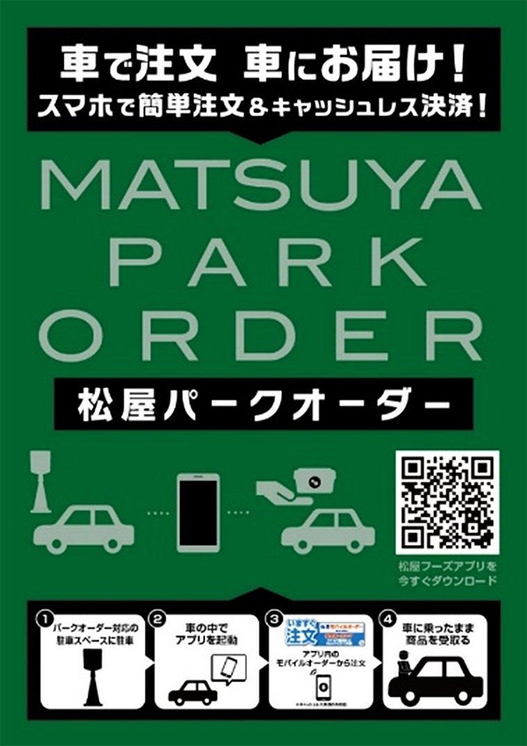 この松屋パークオーダーは、「クルマで待つ。おりずに買える。」がキャッチコピーの「くるまde松屋」のサービスの一貫で、自社開発のオーダーシステムを採用している。