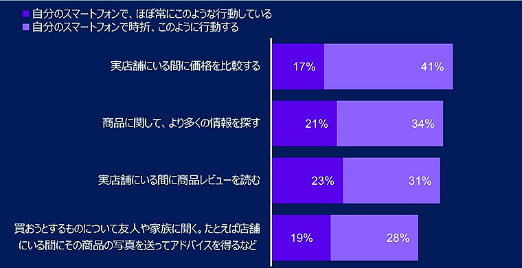 また、日本の買い物客の約5人に2人が、店頭で価格を比較したり、商品情報を調べたりするためにスマートフォンを使うと回答、ミレニアル世代の過半数を占めた。