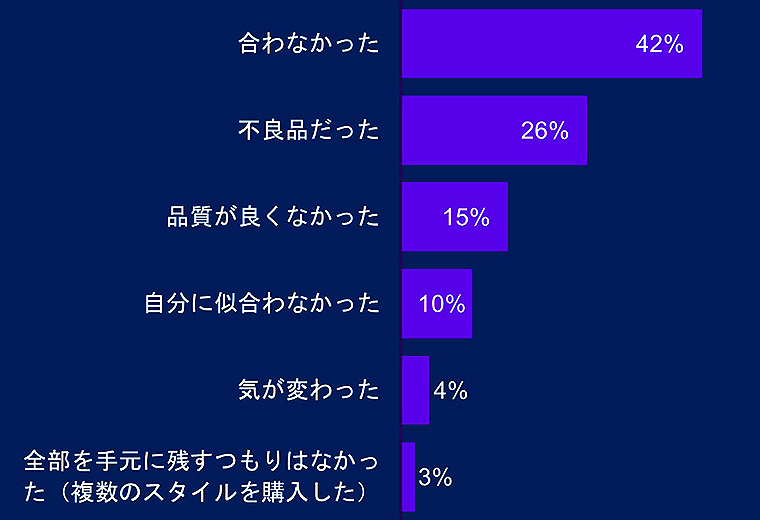 この欠点を補う施策として、ARを利用した商品購入前のバーチャル試着技術サービス導入により、オンラインで購入した商品の返品率を年間最大42%削減。