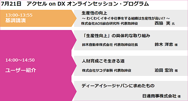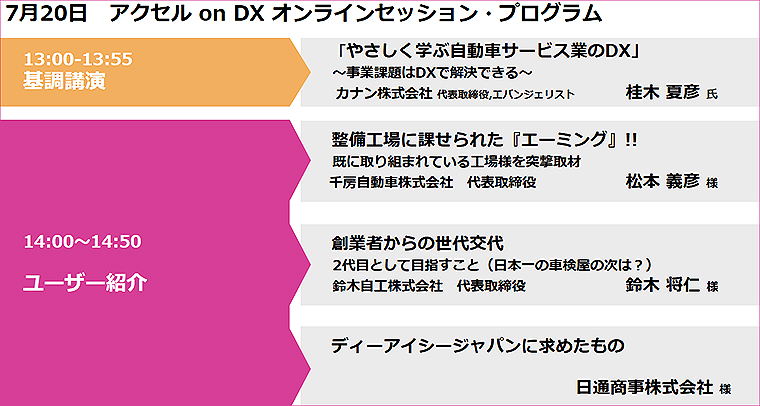 自動車整備業者に向けたITソリューション事業を展開するディーアイシージャパンは、7月20・21日、オンラインイベント「アクセル on DX」を開催。