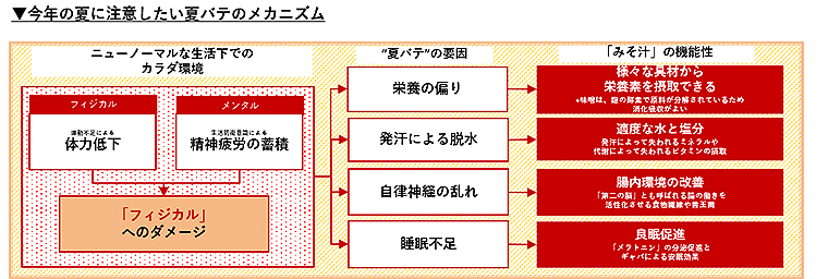 腸内環境の改善―――夏場は室内外の温度差が大きいことで、腸内環境が悪化し、自律神経の乱れにつながります。味噌に含まれている善玉菌や具材に含まれる食物繊維の働きで、腸内環境が整います。