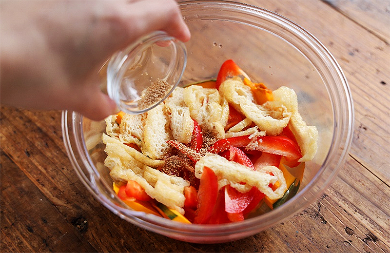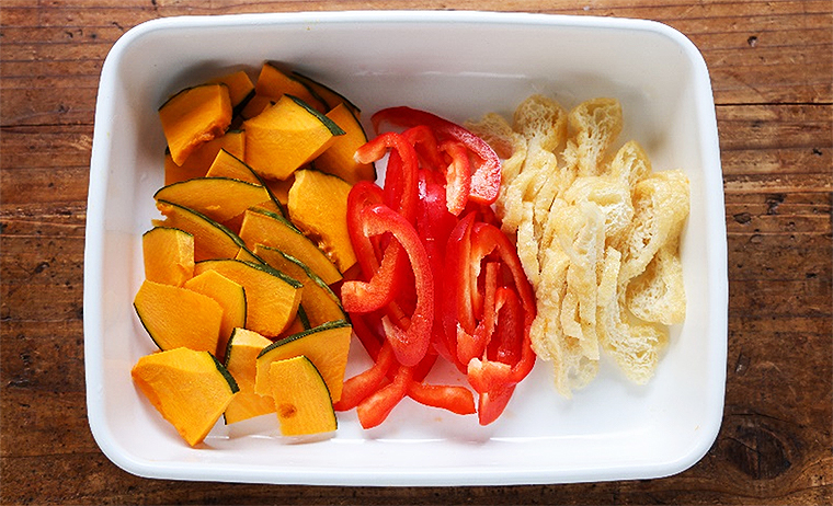 1.かぼちゃはワタと種を除いて5㎜幅の薄切りにし、食べやすい大きさに切る。油揚げは5㎜幅に切る。パプリカは縦薄切りにする。