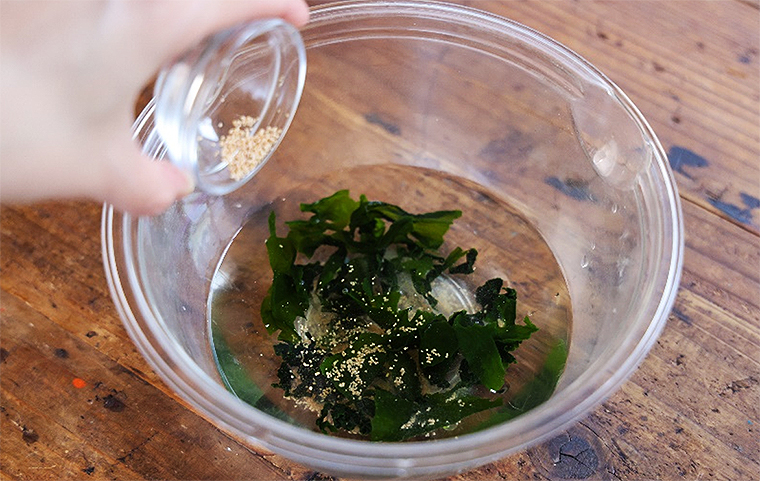 2.耐熱ボウルに乾燥わかめ、水、顆粒だしを入れる。ふんわりラップをかけ、600Wのレンジで1分加熱する。