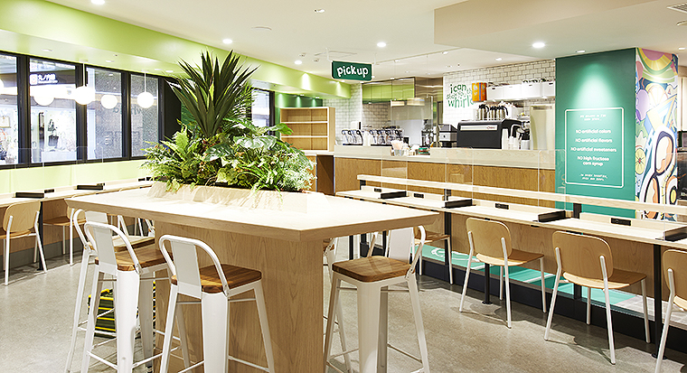 余裕のあるテーブル&チェアのまわりには、コンセント(計23個)やUSB、Wi-Fiも完備、テイクアウトOKだから、ちょっと仕事の合間に、仕事場にスムージー……などなどいろいろな使い方ができる。