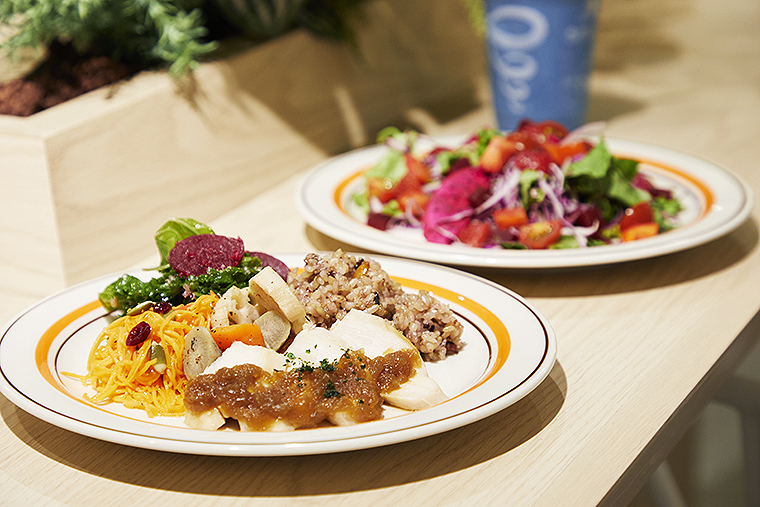 11種のデリのなかから、「とうきびと豆腐のハンバーグ 和風ソース」「ビーツとケールのマリネ」「グリル根菜」「紫キャベツのコールスロー」を選んで、自分だけの“野菜オンリーのヘルシーなデリプレートが完成する。