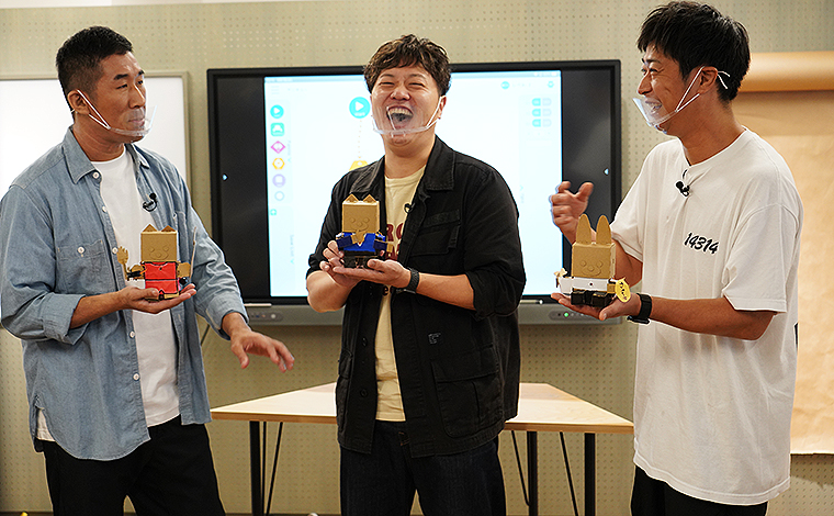 そしてタブレット上でプログラミングを仕込むこと10分。3人それぞれが動かしてみると、実際に狙いどおりに動いて3人とも大興奮。「愛着が湧いてくるよね動くと」と尾形らは笑った。