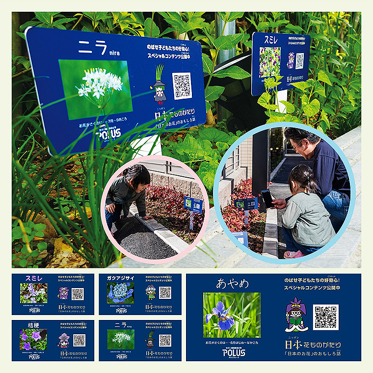 地域の人たちにも開放し、花の解説看板にはQRコードをつけ、子どもの学びにつながる日本花ものがたりサイトへアクセスできる。