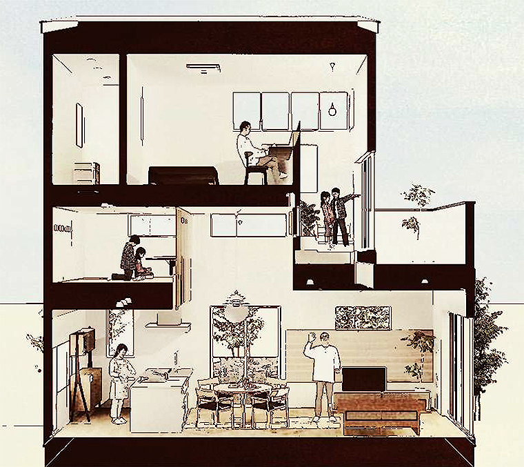 コロナ禍で戸建て住宅志向が高まるなか、ただ広いLDKをつくるのではなく、建物を立体的にとらえ、子どもが自らの創造で居場所と過ごしかたが考えられる建物空間をめざした。