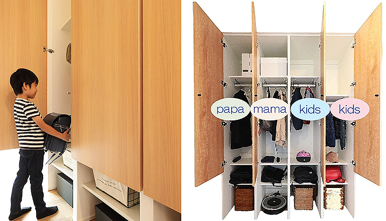 家族みんなが使いやすい個人用シェアロッカー。子どもが片づけしたくなる仕組みとコロナ感染対策に配慮した配置計画で子どもが片付けの習慣を身につけられ、子どもの家事参加による夫婦の家事負担軽減と片付けを通じて子どもの成長と家族のつながりを生み出す。