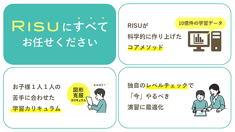 「だから、その子がなぜ成績アップしないのか、苦手がどこのなのかなどパーソナルな部分に目が届かない。「RISU偏差値リカバリー」は、受講者の苦手分野など、学習傾向をひとりひとりに対して効率的な学習ができるようにフォローアップする仕組み」