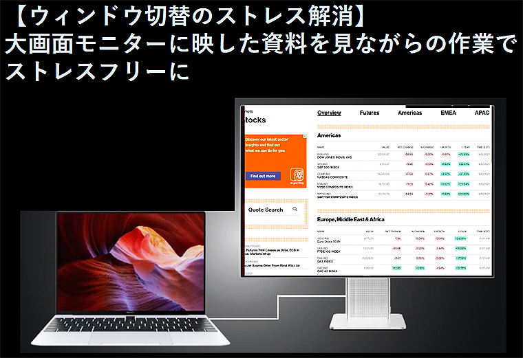 ひとつめは、ウィンドウ切替のストレス解消。HUAWEI MateBook X Pro と HUAWEI MateViewの組み合わせにで、「大画面モニターに映した資料を見ながらの作業でストレスフリーに」。