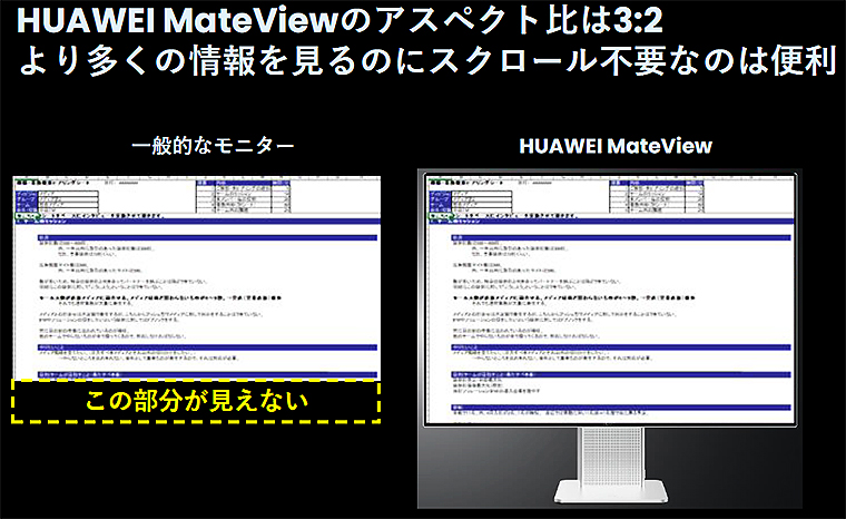 次に HUAWEI MateView のアスペクト比についても評価。「HUAWEI MateViewのアスペクト比は3対2だから、より多くの情報を見るのにスクロール不要なのは便利」と相原代表。