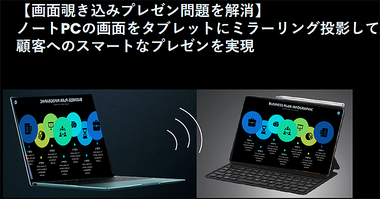 そこで相原代表は、「ノートPCの画面をタブレットにミラーリング投影し、顧客へのスマートなプレゼンが実現できる。これで画面のぞき込みプレゼン問題を解消できる」と教えてくれた。