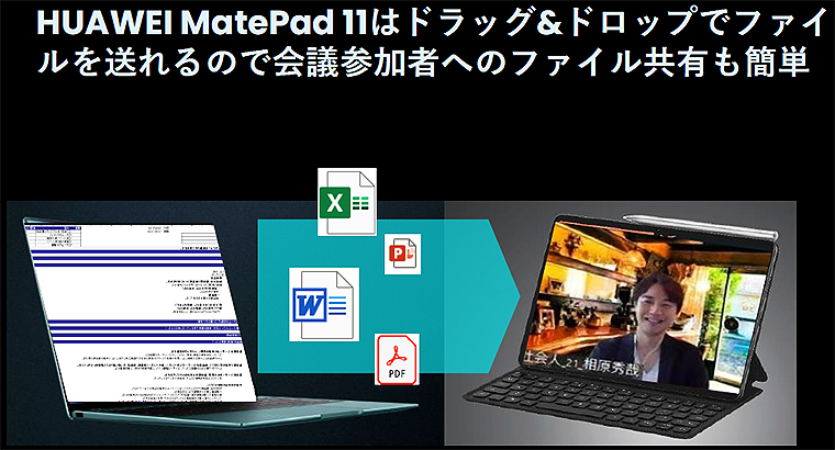 さらに「HUAWEI MatePad 11 はドラッグ&ドロップでファイルを送れるから、会議参加者へのファイル共有もかんたん」とも伝えていた。