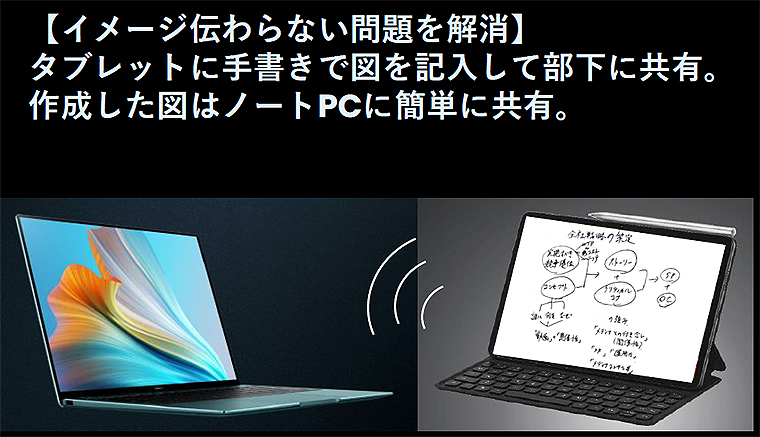 そんなシーンに「タブレットに手書きで図を記入すれば、部下と共有もスムーズにできる。作成した図は、ノートPCにもかんたん共有。これでイメージ伝わらない問題を解消できる」と相原代表はいう。