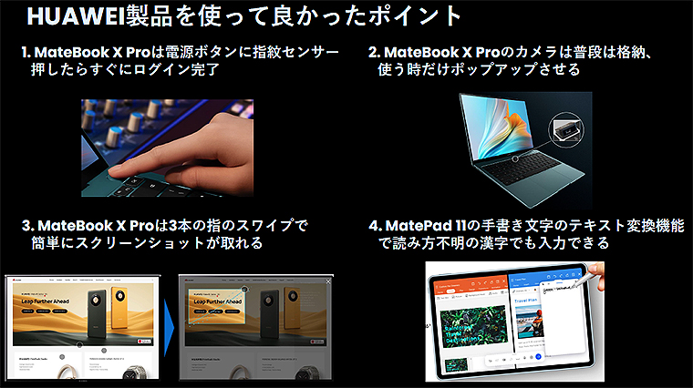 相原代表はこうしたメリットのほか、「HUAWEI 製品を使って良かったポイント」について、次の4点をあげていた。