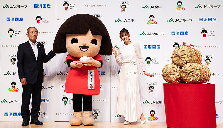 9月22日、神田明神ホールで開いた発表会では、JA全中 中家徹 代表理事会長とJAグループお米消費拡大アンバサダー松村沙友理が登壇。