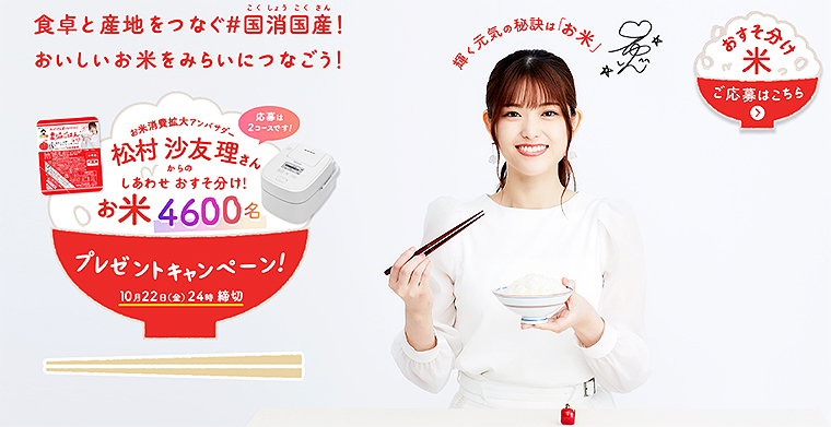 同キャンペーンでは、松村沙友理のアンバサダー写真と直筆メッセージが印刷された、オリジナル限定パッケージのパックご飯「農協ごはん」(JA全農提供)を抽選で4600名にプレゼント。
