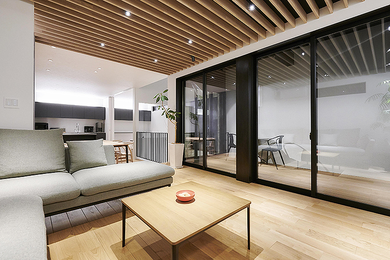 また、LDKの一角の小上がりスペースは、中庭を見通すことができる和の空間に。畳の上でゆっくり寛ぐことはもちろん、ワークスペースとしても活用できる。