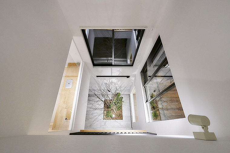 建物はロの字構造で、外部空間と室内を一体化させる中庭が最大の特長。中庭には高さ5mのイヌシデの木、3.8mのアオダモの木が植えられ、そこから吹き抜けを見上げると、青空がのぞける。