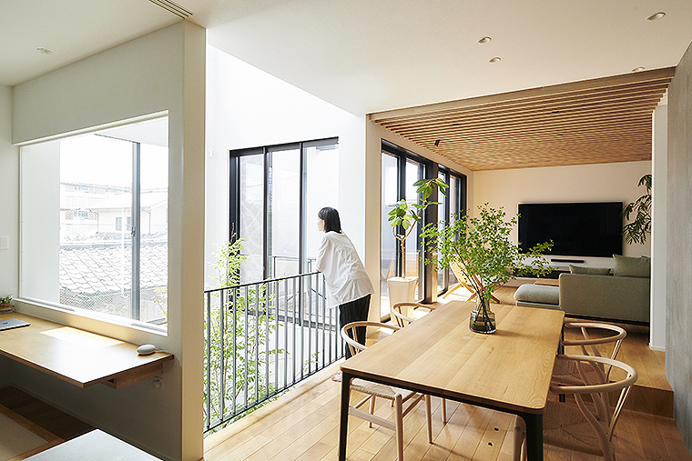 「都内の狭小地にありながらも、プライベートスペースをしっかりと確保した3階建ての家。自然と人間の共存をめざし、家の内外に厳密な境界がないように設計」