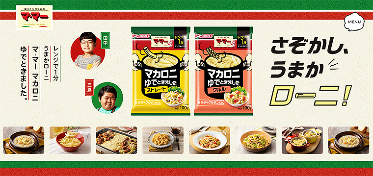 「マ・マー マカロニゆでときました」特設サイト「レンジで1分、うまかローニ」には、彩り豊かでボリュームたっぷりのマカロニレシピを続々公開中!
