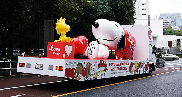 巨大なスヌーピーが行くスヌーピートラック「SNOOPY HAPPINESS FLOAT 2021」。その走る地は、東京、札幌、仙台、郡山、長野、金沢、名古屋、大阪、神戸、高松、岡山、広島、博多、熊本、横浜の15都市を予定。