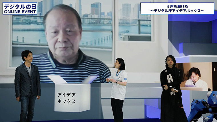 また、牧島デジタル大臣 夏野剛 落合陽一 西村博之による「声を届ける ~デジタル庁アイデアボックス~」では、デジタル社会のかたちやデジタル改革の進めかたについて、国民から意見やアイデアを幅広く募集し、オープンに共有・議論する場「デジタル庁アイデアボックス」に取り組んでいることを紹介した。