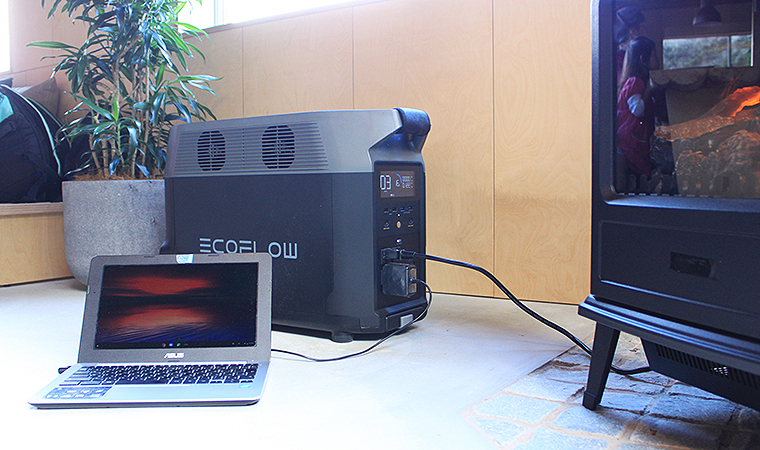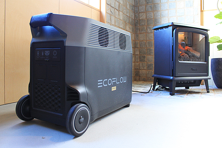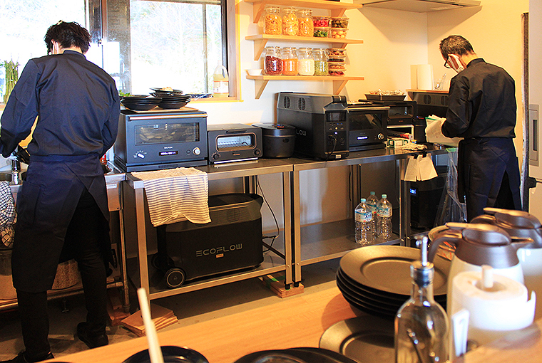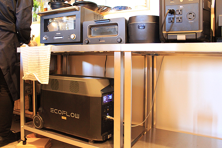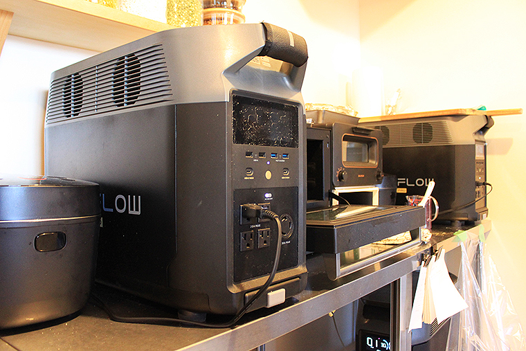 この冷泉小屋に備わる暖房器具、照明、冷蔵庫、オーブントースター、炊飯器、電子レンジ、換気扇……あらゆるものがすべて、実はEcoFlow Technology Japan(エコフロー・テクノロジー・ジャパン)のポータブル電源だけで動いている!