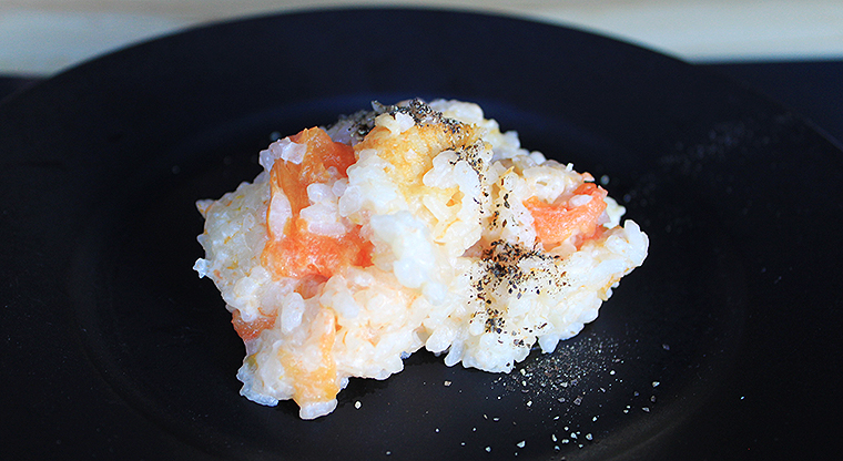 ◆ワンスプーン・チーズリゾット―――1食分のエネルギーを満たす濃厚な一口。炊飯器(1100W)早炊き40分、約180Whで調理。