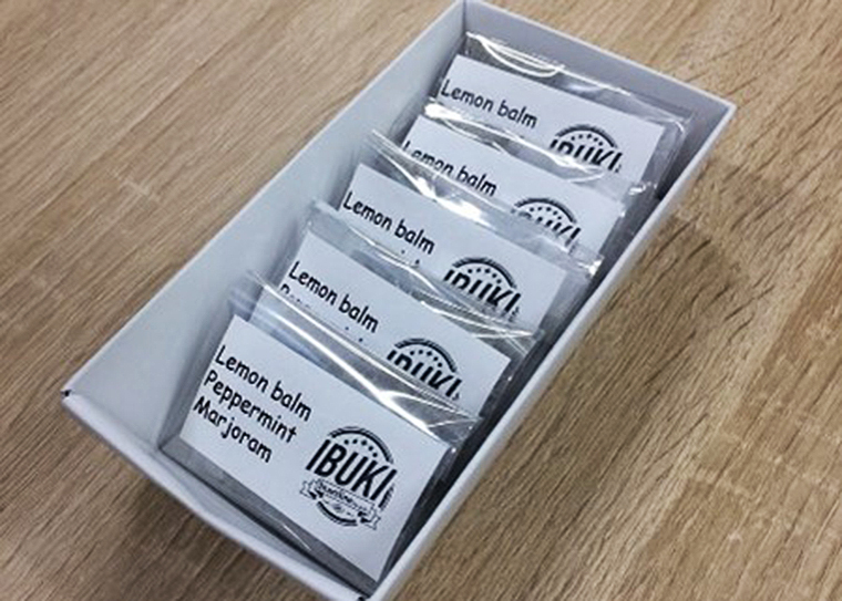 また「おウチでIBUKIのハーブティーを飲もう」という気持ちを込めて、店内のIBUKIコーナーに立ち寄ると、持ち帰り用のハーブティーバッグをプレゼントする。