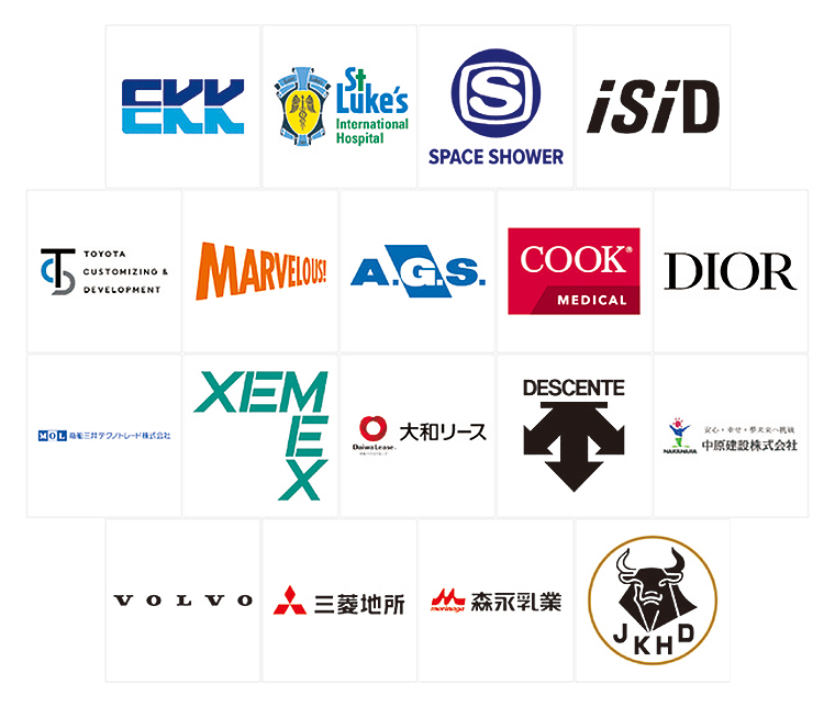 イーグル工業、聖路加国際大学、シモジマ、スペースシャワーネットワーク、電通国際情報サービス、トヨタカスタマイジング&ディベロップメント、マーベラス、AGSコンサルティング、クックメディカルジャパン、クリスチャンディオール、商船三井テクノトレード、ゼオンメディカル、大和リース、デサントジャパン、中原建設、ボルボ・カー・ジャパン、三菱地所、森永乳業、JKホールディングス ほか (50音順 敬称略)