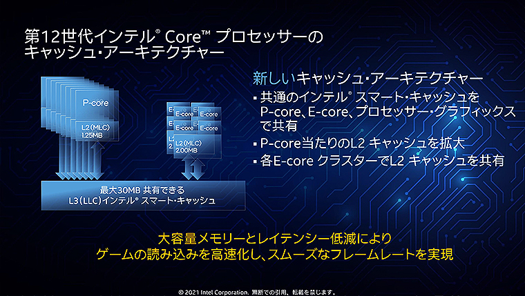 今回のオーバークロック対応デスクトップ・プロセッサー6モデルの最大の特長は、インテルが開発した最高レベル性能を発揮するCPUコアの Performance-cores(P-cores)と、スケーラブルなマルチスレッド・ワークロードの Efficient-cores(E-cores)による、初の高性能ハイブリッド構成プロセッサー・シリーズである点。